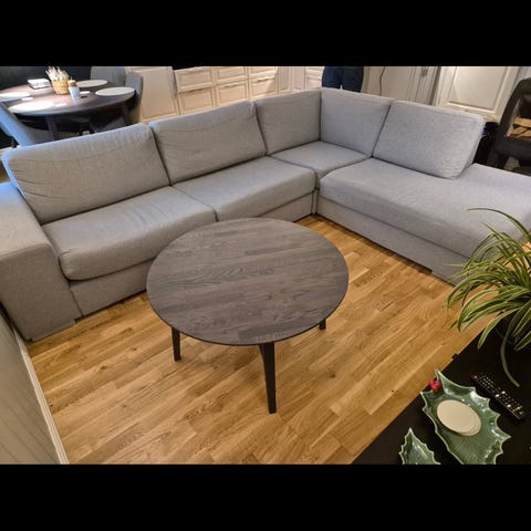 Selger en stor brukt hjørnesofa i sort/mørkt stoff for 2000 kr. Sofaen har stått oppbevart tørt over tid, men putene kan lukte litt fukt og kunne trengt en rens. Ingen store flekker, rifter eller hull i stoffet. Selges fordi utformingen ikke passer i ny stue.