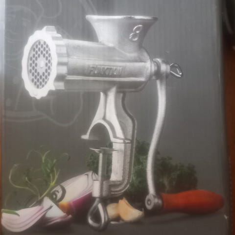 Universal No 2 Kjøttkvern i metall med håndsveiv og trehåndtak. Laget i England, designet for manuell kverning av kjøtt. Egnet for hjemmebruk og matlaging.