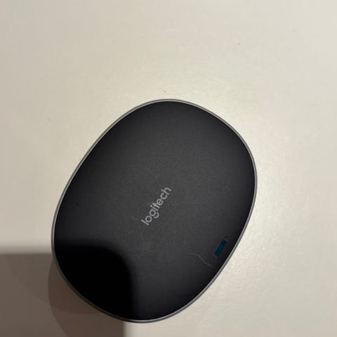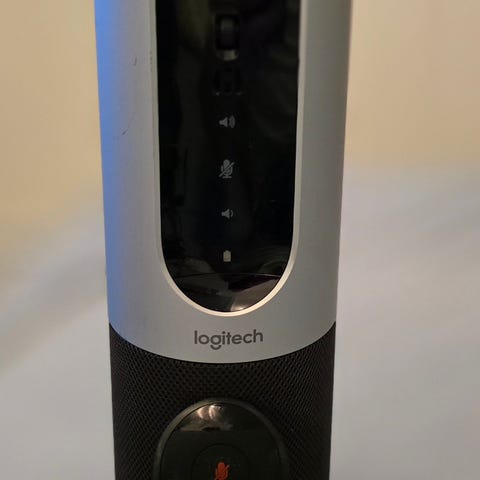 Logitech Meetup konferansehøyttaler med integrert kamera og mikrofon. Enheten er designet for møterom og tilbyr video- og lydløsning for gruppekommunikasjon. Tilkoblingsmuligheter inkluderer USB, og enheten har kontrollknapper for enkel betjening.