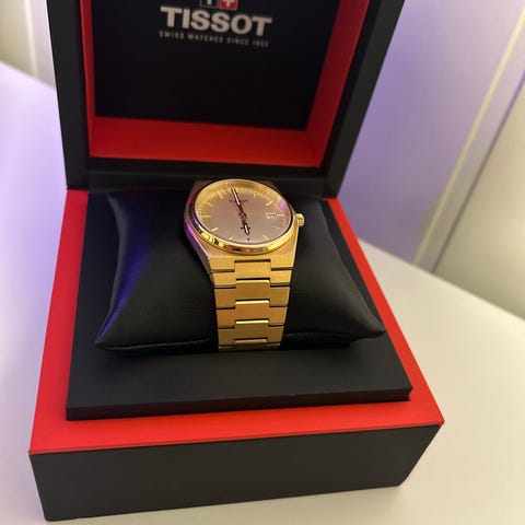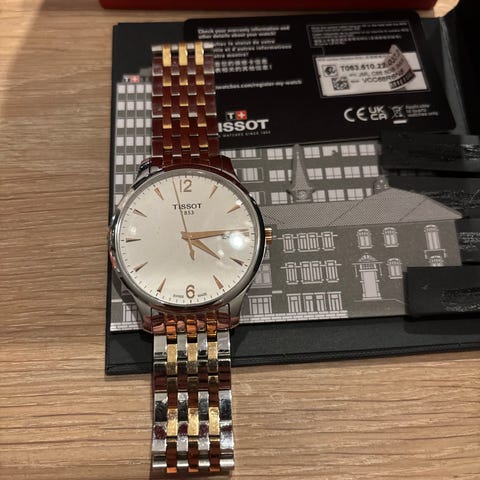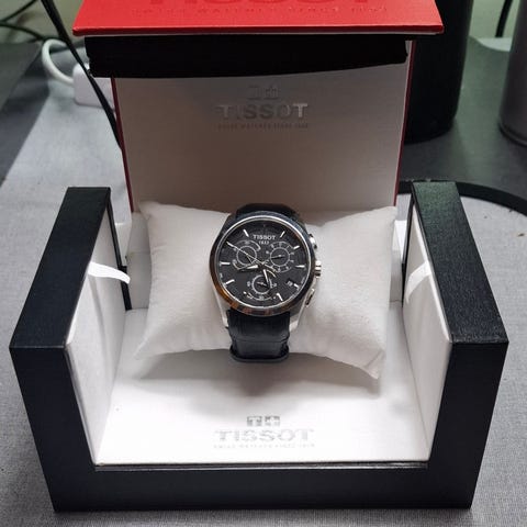 Tissot herreklokke med stål lenke og svart urskive. Klokken har kronograffunksjon og datoindikator. Designet for herrebruk, med tydelige markeringer og roterbar bezel.fått som gave for 25 år. Ikke brukt koster 8000 hos thune.