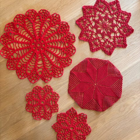 Selger massevis av håndheklede duker, strandnett, dekkebrikker, små og store Doily’s i forskjellige størrelser, alt er heklet i 100% bomull utenom de firkantede i jule farger, de er i 100% Akryl, i forskjellige tykkelser. DETTE ER FINE GAVER MAN KAN GI TIL JUL ELLER VENNINNEGAVER ELLER VERTINNEGAVER. 😄