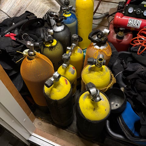 Faber, stål 10L 300 bar. Sist trykktestet september 2017. Må altså inn til test. Har stått med omtrent 100 bar trykk under lagring. Jeg har sjekket luften, og den hverken lukter eller smaker rart.