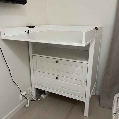 IKEA SMÅSTAD stellebord i hvit farge. Mål: 90 cm bredde, 79 cm dybde, 100 cm høyde. Laget av slitesterkt materiale med flere oppbevaringsrom og hyller. Passer til barnerom for trygg og praktisk stelleplass.