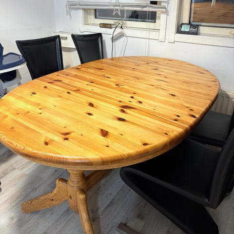 Fint spisebord. Den er har en ektra plate 80 cm. Total bredde 280 cm. Må hentes.