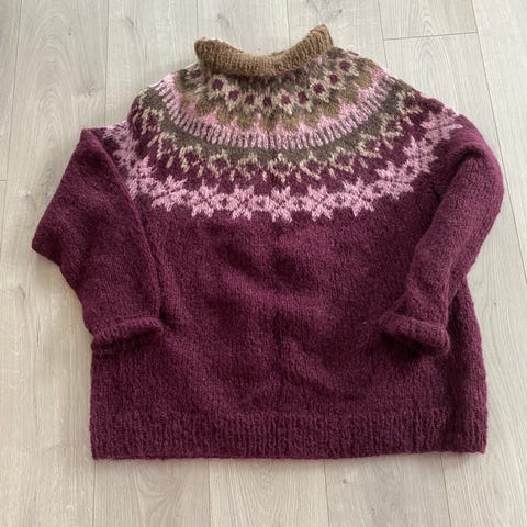 Ny strikket genser i grått sky garn som skifter farge. Den er myk og god,klør ikke. Selges for 950,- + porto SENDER KUN MED POSTEN