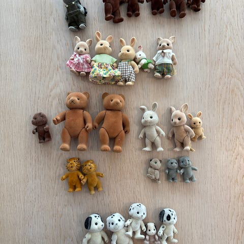 Det er tre familier og to enkle dukker som ikke har vært lekt med på noen år. Ca. 25 år gamle. Ikke alle har klær.