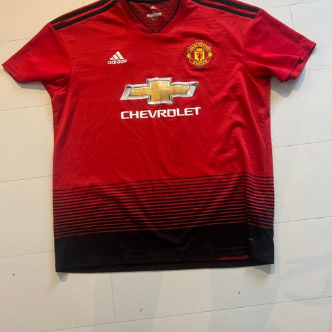 Adidas Manchester United fotballdrakt i størrelse medium. Drakten er rød med Manchester United-logo og har materialetikett med vaskeanvisninger. Passer til bruk som sportsklær eller supporterutstyr.