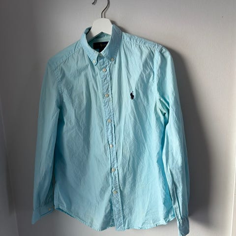 Ralph Lauren skjorte for barn i størrelse 3 år, designet for gutter. Skjorten er hvit og laget av bomull. Den har knappelukking og klassisk krage. Den har en flekk man kan se på bilde + antydning til annen flekk. Selges derfor rimelig. Flekkene synes ikke særlig ved brukt.
