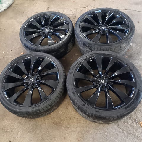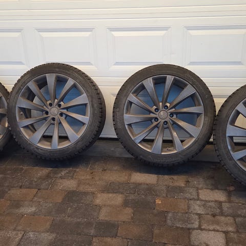 Tesla Model X felger med vinterdekk, noen av dekkene er slitt ned til korden og kan ikke brukes.