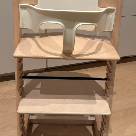 En fin rød Tripp Trapp selges med originalt Stokke utstyr;