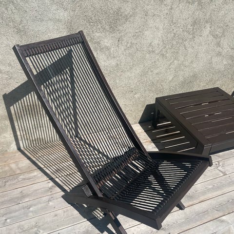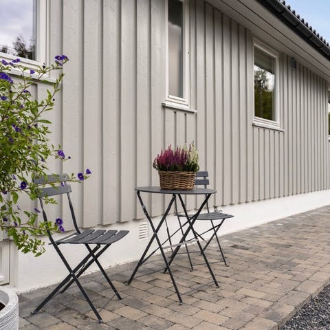 Utemøbelsett bestående av metallramme med to benker, to stoler og to bord i forskjellige størrelser. Settet har et enkelt og funksjonelt design, egnet for utendørs bruk på terrasse eller veranda.