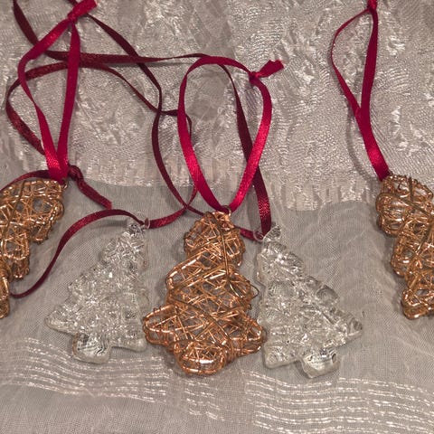 Julepynt laget av metall og glass, inkludert figurer som reinsdyr, hjerte, stjerne og juletre. Pynten har transparente glassdetaljer og er utstyrt med bånd for oppheng. Passer til dekorasjon i julesesongen.
