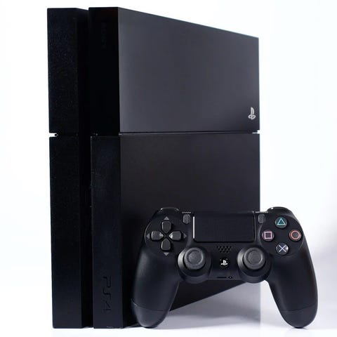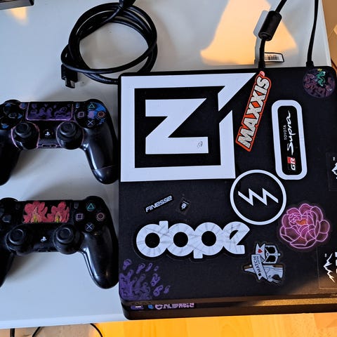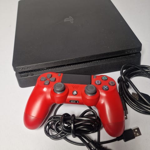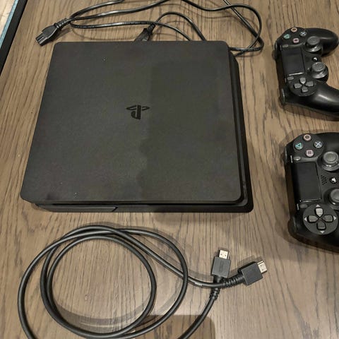 Sony PlayStation 4 spillkonsoll i svart farge med tilhørende kontroller. Konsollen er designet for spill og multimedia underholdning.