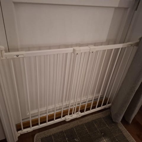 BabyDan barnesikringsgrind i hvit farge med justerbar bredde fra 62,5 til 106,8 cm.