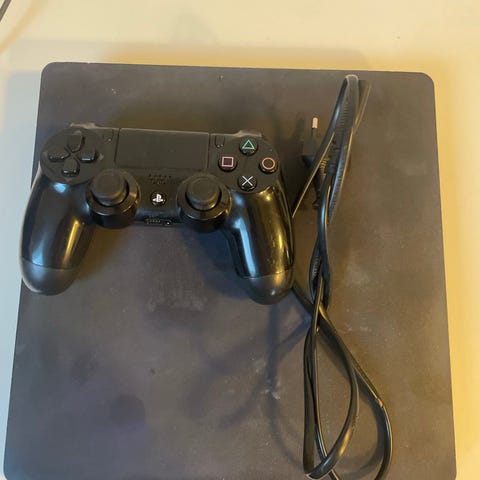Sony Playstation 4 spillkonsoll med tilhørende kontroller. Konsollen er designet for å spille Playstation 4-spill og leveres med en trådløs kontroller. Farge: svart.