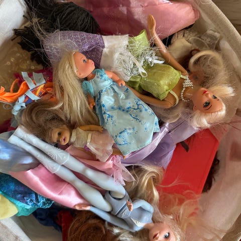 Selger en kasse med en barbie med diverse klær og utstyr som kjøkkenytstyr og strreoanlegg. Fra 1990 tallet og tidlig 2000. Selges samlet og hentes på nesttun i bergen.