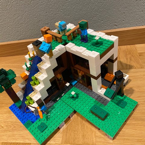 LEGO Minecraft byggeklosser med tema fra Minecraft-verdenen. Inneholder flere figurer og byggedeler som representerer elementer fra Minecraft-spillet.