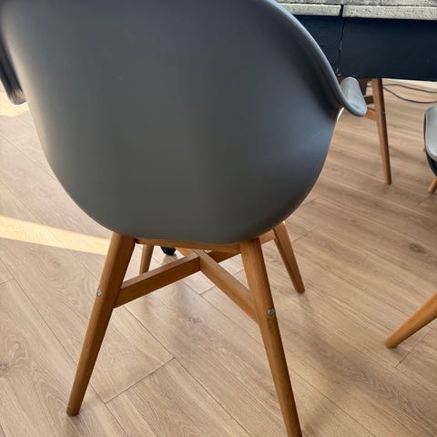 Selger en fin plaststol med eik treben. Brukt denne som kontorstol hjemme.