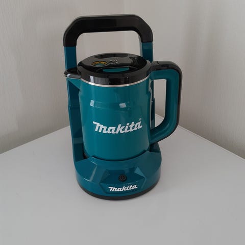 Makita Cordless Kettle trådløs vannkoker med 18V og 36V batterispenning. Farge blå. Egnet for bruk uten ledning, praktisk for utendørs eller mobile behov. Denne koster ny kr. 3000.