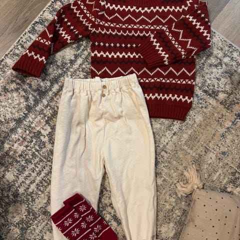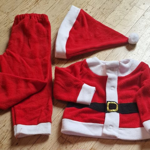 julekostyme for gutt i størrelse 104. Kostymet er rødt med hvite pelsdetaljer, og består av jakke, bukse og lue. Passer til bruk ved julefeiringer og kostymeanledninger.