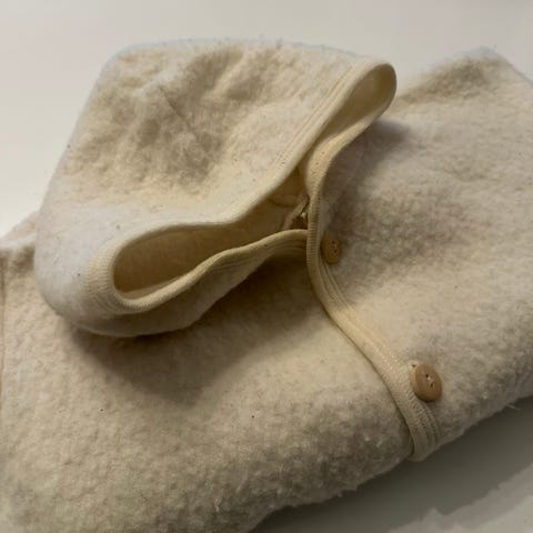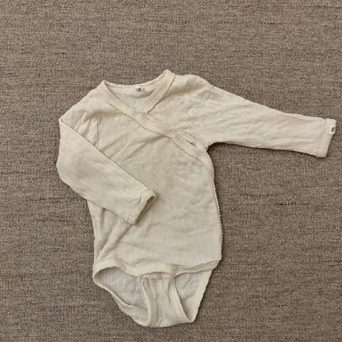 Flere plagg til baby fra Nøstebarn. Mye i fin stand, enkelte plagg har liten grad av toving, men fullt funksjonelle likevel. Sparkebuksen har noe misfarging jeg forsøkte å få med på bildet, men det ble veldig lite synlig etter en runde med sitronsåpe. Den vanlige buksen er litt mer tovet, og har en liten misfarging som ikke har blitt forsøkt fjernet.