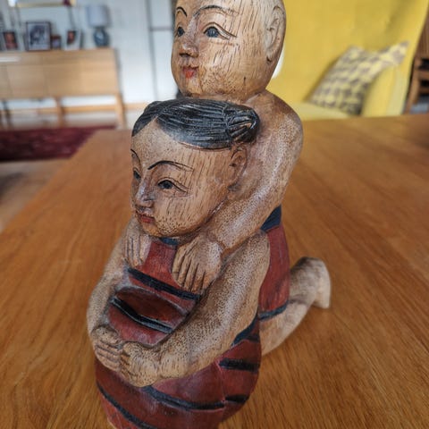 Sjarmerende og uttrykksfull dekorfigur med to figurer sittende sammen. Figuren har et varmt, humoristisk uttrykk og passer fint som hyllepynt, vitrineskap eller som en litt annerledes interiørdetalj.