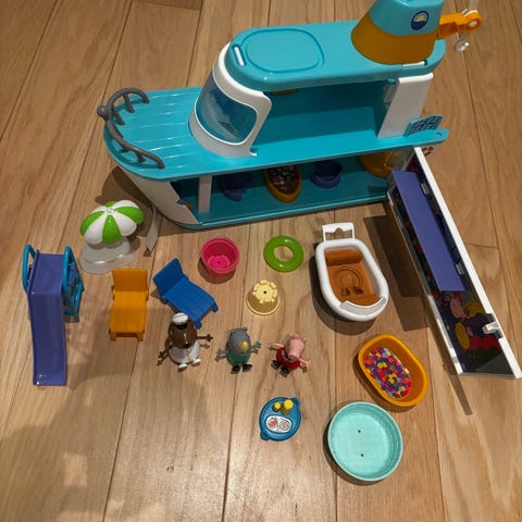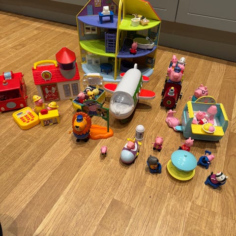 Peppa Gris lekesett som inkluderer et dukkehus med flere rom, møbler og figurer.