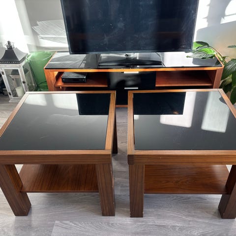 TV benk fra Fagmøbler. Sort glassplate på toppen. 150cm bred.