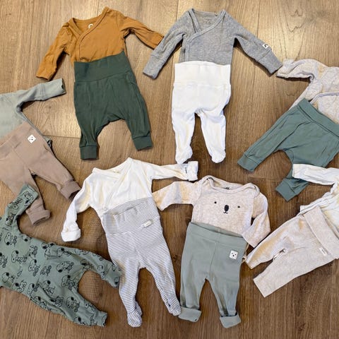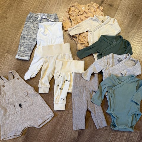 Klespakke med 10 bodyer og 10 bukser. Alle plagg i størrelse 50. Klær fra Kappahl, Joha, HM og Newbie.