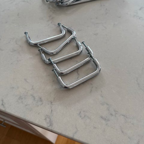 Vi har byttet håndtak på kjøkken og selger derfor de gamle håndtakene. De er i god stand og er fra Norema. De kommer med skruer, hvor et par av skruene er i dårlig stand og andre er helt nye. Sentermål fra skruehull til skruehull er cc192mm. Fargen er børstet stål. Selges samlet.