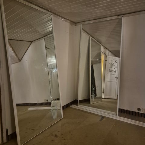 4 stykk skyvedører til garderobe selges. Svart glass med noe speileffekt. Dørene er 96 cm brede og 239 cm høye.