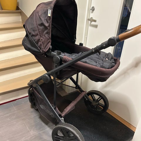 Hauck barnevogn med svart stoff og brun detalj på håndtak. Vognen har flere funksjoner for tilpasning og komfort. Egnet for barn og designet for praktisk bruk.