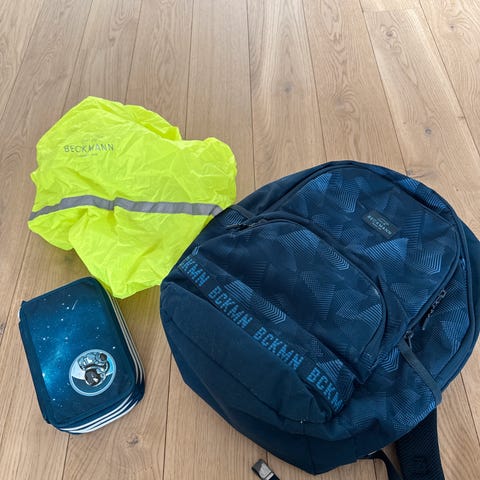 Selger pent brukt skolesekk og gymbag fra Beckmann. Ekstra regntrekk følger med