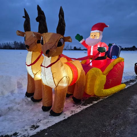 Kulz luftfylt julenisse på 120 cm lager en amerikansk julestil. Dekorasjonen er utstyrt med fargerike LED-lys og selvoppblåsbar funksjon med innebygd vifte. Julenissen er lett å tømme og tar liten plass når den skal oppbevares.