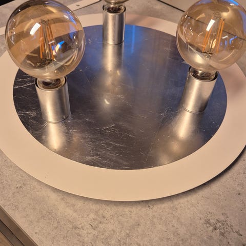 Selger en hvit taklampe, gir godt lys. Kan skyves opp eller ned. Diameter 46 cm . Ingen riper eller merker.