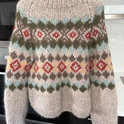 Strikket i alpakka silk garn,størrelsen passer en M/L.