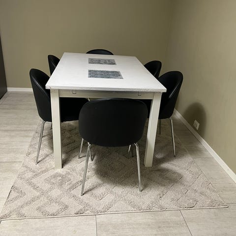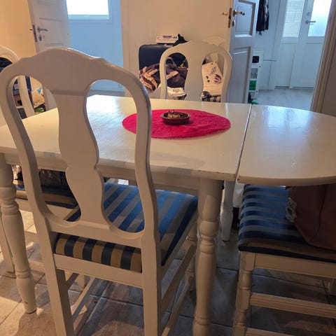 Farge hvite kjøkkenstoler og bord til liten leilighet.