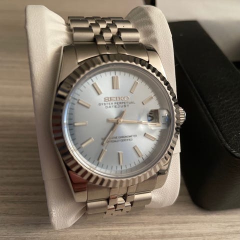 Flott seiko-mod, skrukrone og automatisk seiko urverk med ca. 40 timer gangreserve. Jubilee lenke. Reisepouch, ekstra ledd og verktøy for å bytte. Kommer med utstillingsholder. Klokken er å betrakte som ny.