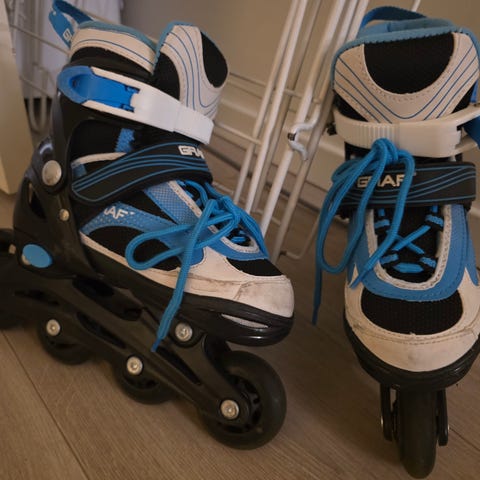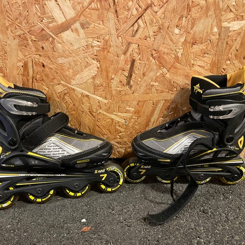 Nike rulleskøyter for barn i svart og rosa. Utstyrt med justerbar lukking og hjul for rulleskøyting.