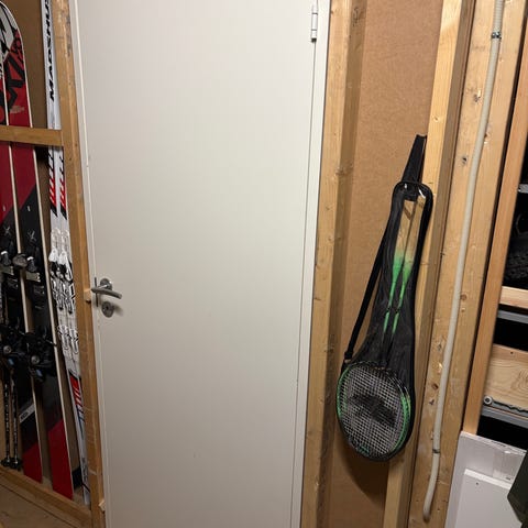 Det følger med karm, eikelist, dørhåndtak og lås med nøkkel. Fargen er bomull.