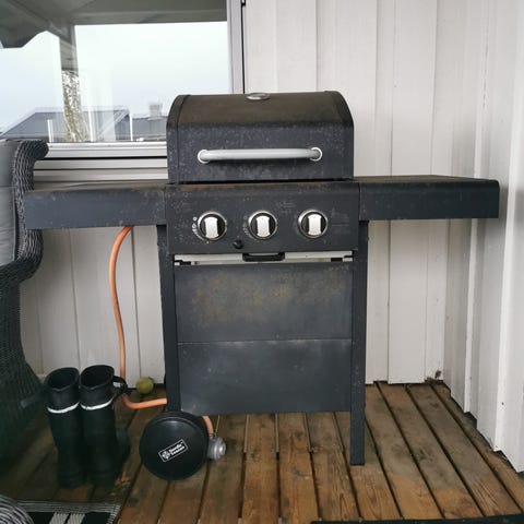 Outback Companion gassgrill med lokk i rustfritt stål, trehyller under og på siden for oppbevaring, og hjul for enkel flytting. Grillen har tre kontrollknapper for justering av varmen. Passer til utendørs bruk.