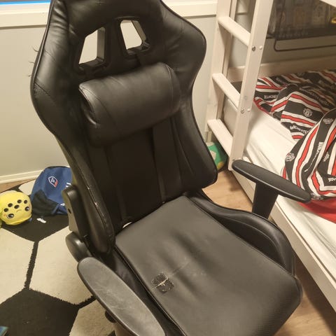 Gamingstol i svart og hvitt med nakkestøtte og justerbare armlener. Stolen har en ergonomisk design med høy rygg og er egnet for lengre bruk ved skrivebord eller gaming. Har kun brukt det til gaming og det funker veldig bra. Grunnet salg er at jeg har fått ny som gave,