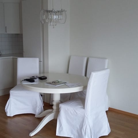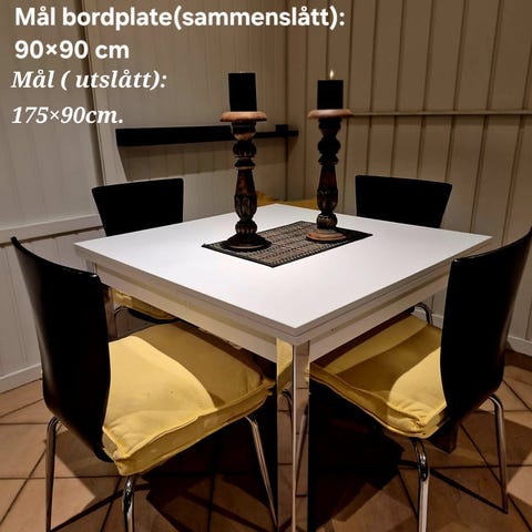 Kjøkkenbord med to klaffer og tre stoler. Alt i heltre. Selges samlet for 2.000,-