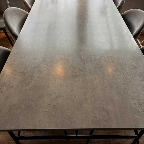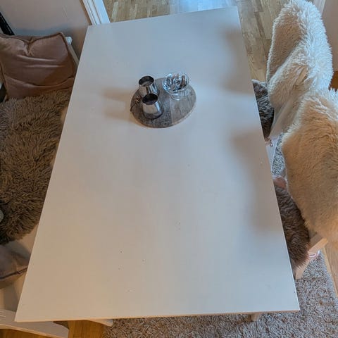 Praktisk, pent, sort spisebord. Litt slitt bordplate noen steder, se bilde. Det mangler en skrue under det ene skråneinet - se bilder av skråbeina. Det har ikke hatt noen praktisk betydning for bruken.