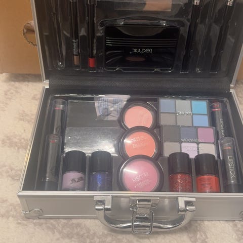 Helt ubrukt sminkesett med øyenskygger, blush, maskara og diverse. Kun åpnet fordi pappen utenpå fikk vann på seg, ingen skader inni.