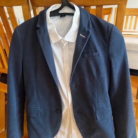 H&M Blågrå gutt blazer i størrelse 152. Pent brukt. Se også mine andre annonser. Har flere dresser liggende her på finn.no.