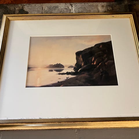 Odd Nerdrum Citadellet 1979 kunstverk. Trykk av maleri med motiv av landskap, innrammet med gullfarget ramme. Originalt trykk datert 1979. Passer til dekorasjon og samling av kunstinteresserte. Kvalitetskontroll står på en av de 2 bildene. Størrelse 35x45 cm