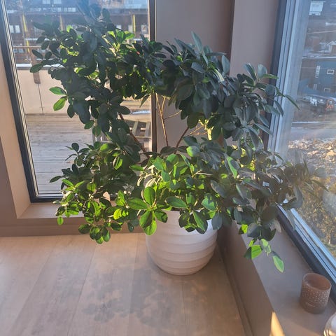 Fikus plante med grønne blader. Planten har flere grener med store, grønne blader. Passer som dekorativ innendørs plante. Er i plast og stråvasen /-kurven kan komme med