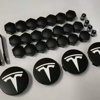 Nytt sett senterkopper, svarte mutterhetter og ventilhetter med logo til TTesla Model Y Juniper selges