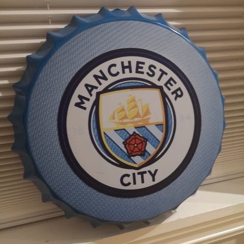 Stilig Manchester City logo i lyseblå, hvite og gylne farger – perfekt som dekorasjon på hylle, skrivebord osv.